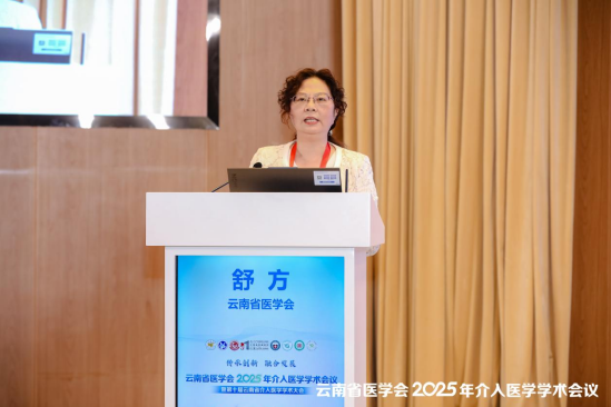 舒方副会长兼秘书长表示介入医学是新兴交叉学科,具有微创、安全、高效等特点,会议以传承创新等为主题,设9个专题会场,百余位省外专家参会,共推介入事业发展。今年中华医学会成立110周年,云南省医学会以高质量学术活动献礼,秉承其优良传统。感谢辛苦筹备会议的团体,期望专家常来传经送宝,推进介入医学发展,祝会议取得圆满成功。